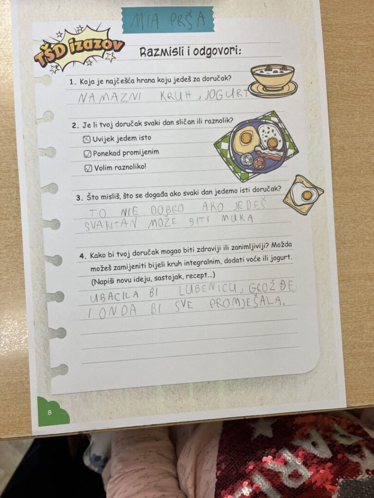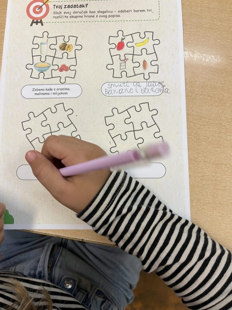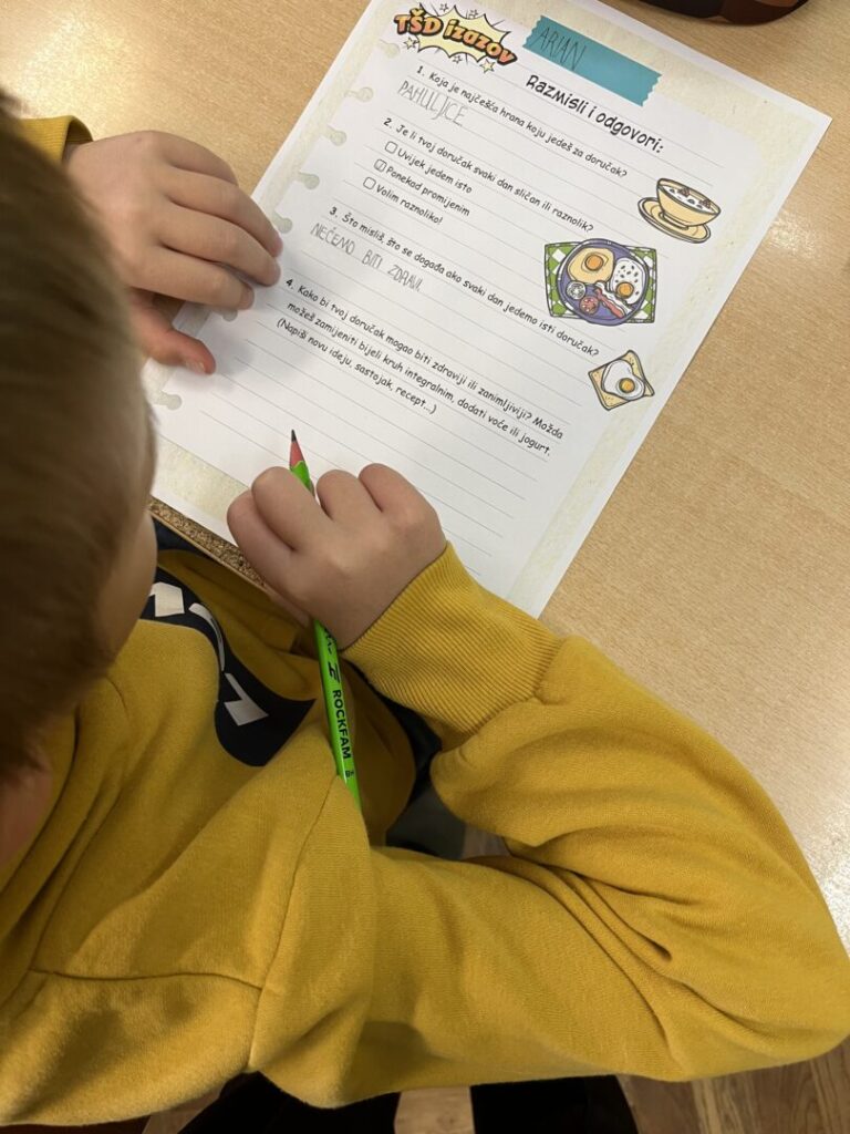 Na početku smo razgovarali o važnosti doručka za naše zdravlje i funkcioniranje na nastavi te analizirali što mi to zapravo jedemo svakog jutra. Biramo li isti doručak ili volimo da je raznolik. Zaključili smo da je važno jesti raznovrsnu i raznobojnu hranu, a svoju kreativnost učenici su pokazali u osmišljavanju novih kombinacija namirnica i zdravih recepata za doručak.