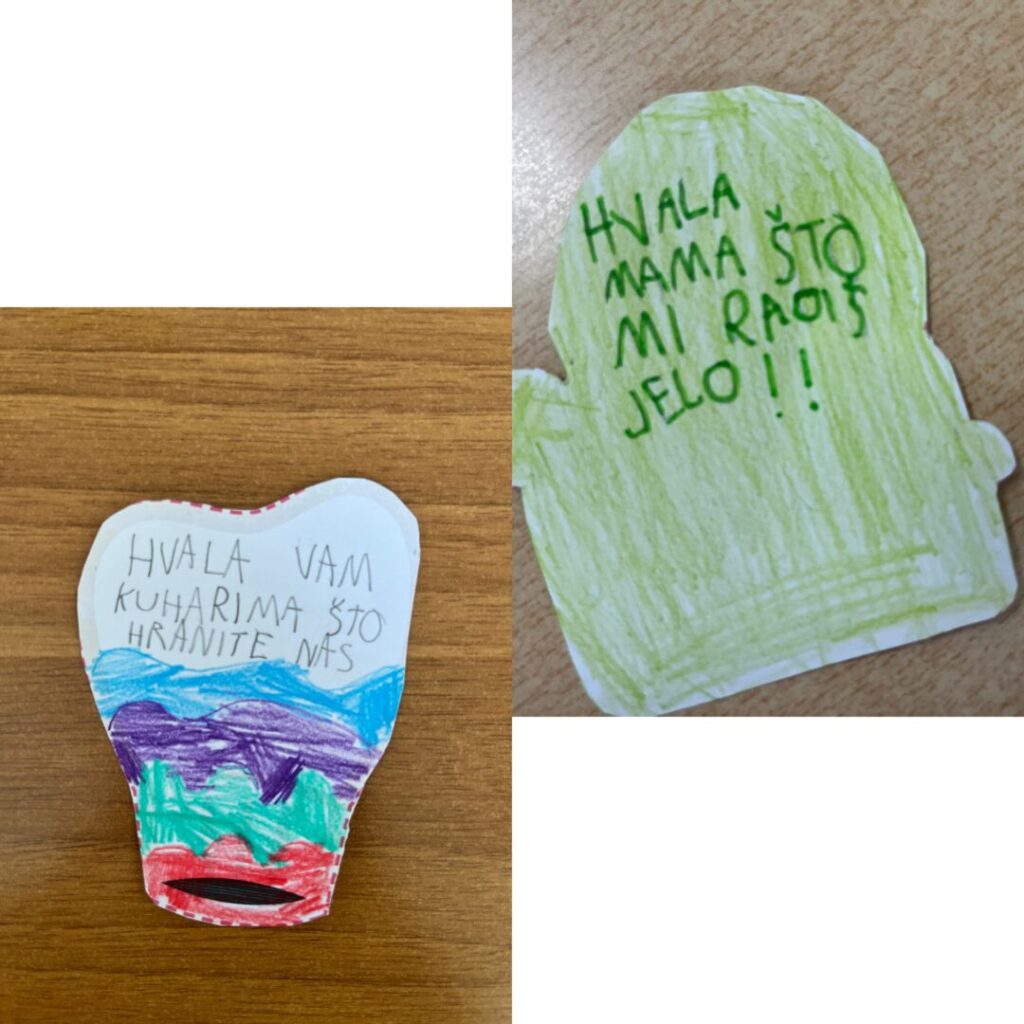 Na papirićima u obliku tanjura, lonca, žlice, valjala i ostalih kuhinjskih pomagala učenici su pisali što su naučili ili isprobali novo ovaj tjedan te poruke zahvalnosti svojim najbližima i školskim kuharicama, koje im svakodnevno pripremaju ukusne i zdrave obroke.